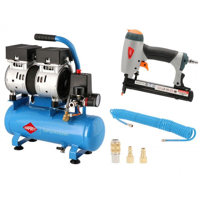 Silent oil free air compressor L 6-105 + air staple gun type 80 up to 25 mm + spiral air hose 7.5 m - For the upholsterer!